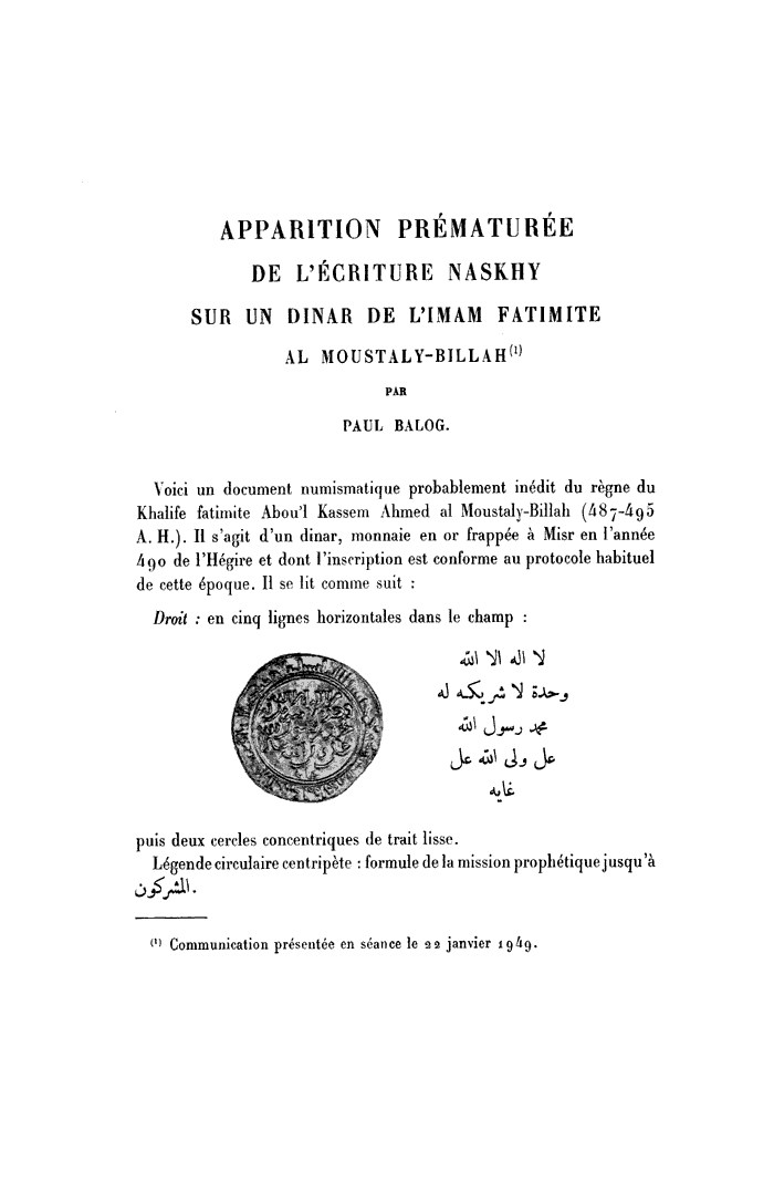 Apparition prématurée de l'écriture naskhy sur un dinar de l'Imam Fatimite al Moustaly Billah