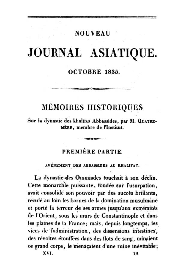 Mémoire historique sur la dynastie des Khalifes Abbassides