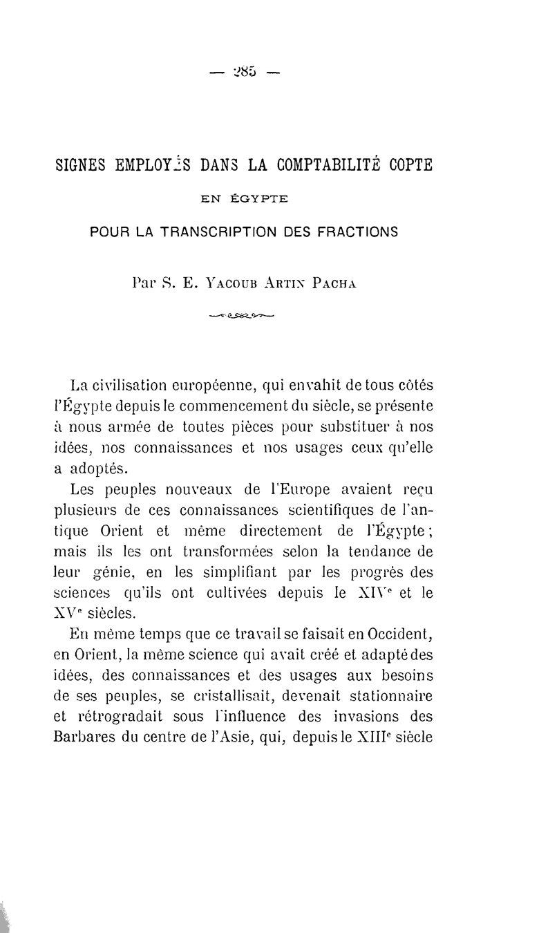Signes employés dans la comptabilité copte en Egypte pour la transcription des fractions