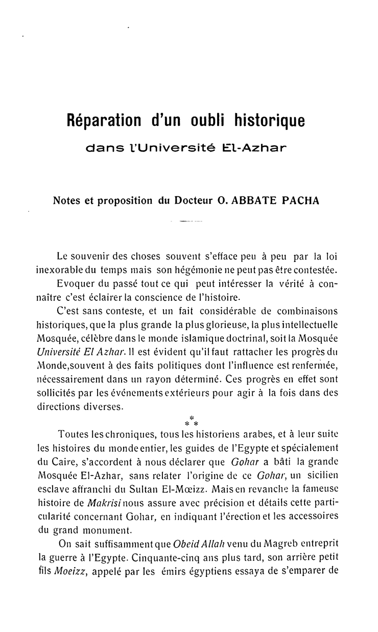Réparation d'un oubli liistorique dans l'Université El-Azhar Notes et proposition du Docteur O. ABBATE PACHA