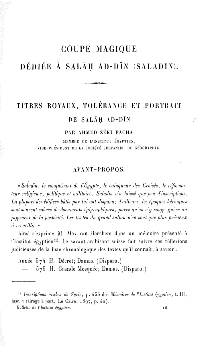 Coupe magique dediee a Salah ad-Din : titres royaux, tolerance et portrait
