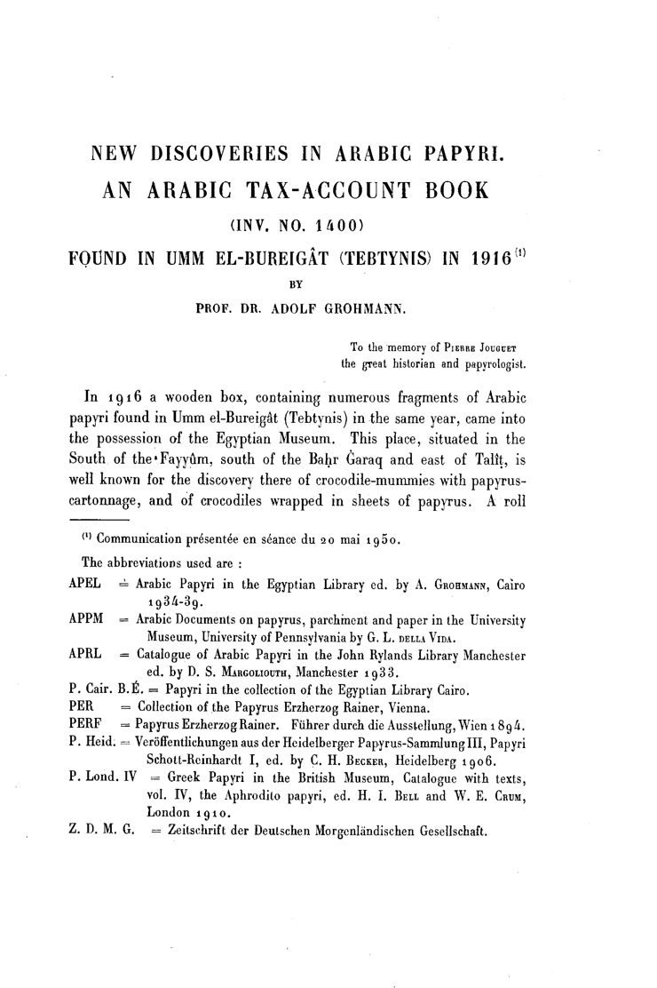 New Discoveries in Arabic Papyri. An Arabic Tax-Account Book (inv.no. 1400) Found in Umm El Bureigât (Tebtynis) in 1916