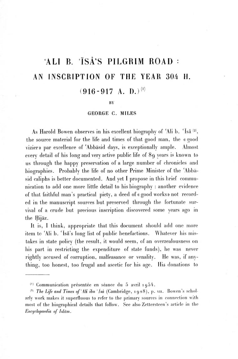 Ali b. 'isa's Pilgrim Road: an inscription of the year 304 H. (916-7 A.D.)