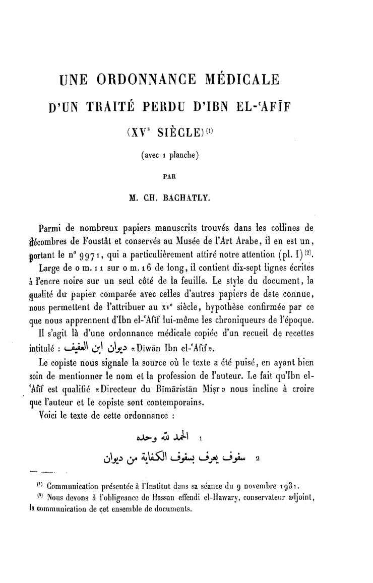 Une ordonnance médicale d'un traité perdu d'Ibn el-ʿAfīf (XVe siècle)