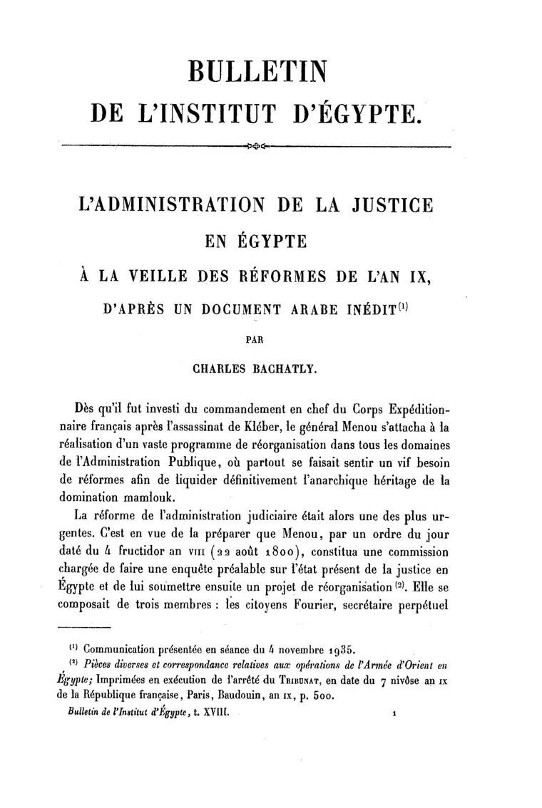 L'Administration de la justice en Egypte a la veille des reformes de l'an. IX, d'apres un document arabe inedit