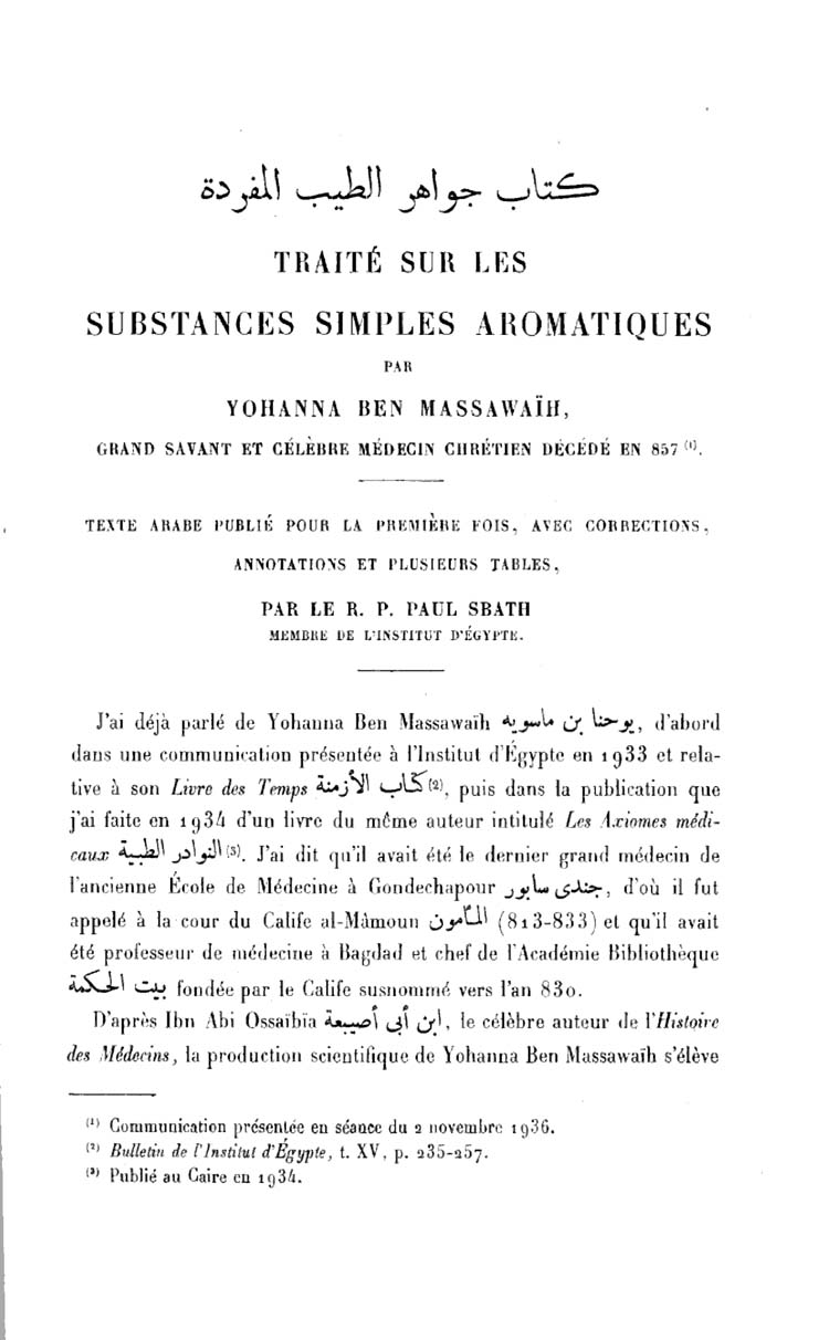 Traité sur les substances simples aromatiques par Yohanna ben Massawaïh, grand savant et célèbre médecin chrétien décédé en 857. كتاب جواهر الطيب المفردة