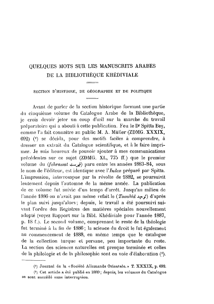 Quelques Mots sur les Manuscrits Arabes de la Bibliothèque Khédiviale - Section d'histoire, de Géographie et de Politique