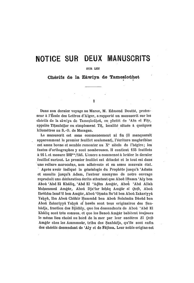 Notice sur deux manuscrits sur les chérifs de la Zâwiya de Tamesloûhet