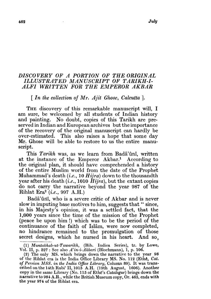 Discovery of a portion of the original illustrated manuscript of Tarikh-i - Alfi written for the Emperor Akbar