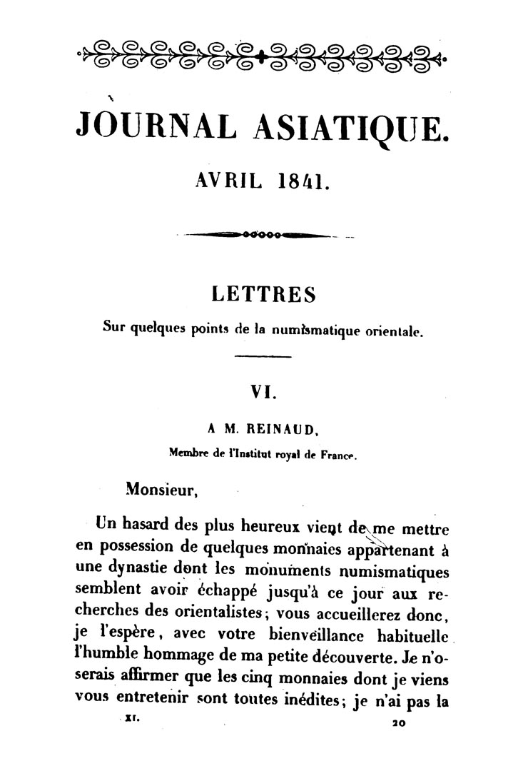 Lettres sur quelques points de la numismatique arabe à M. Reinaud, membre de l'Institut de France.(VI)
